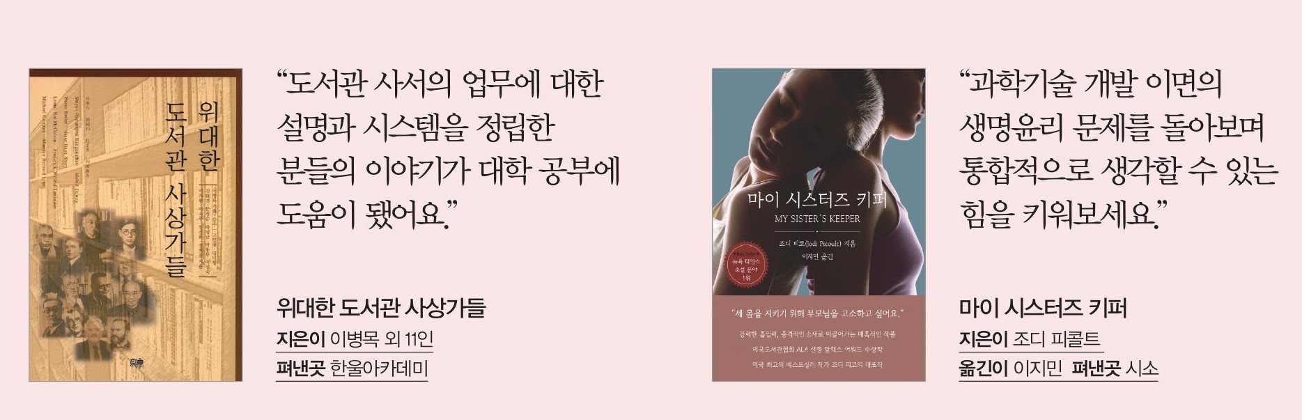 A <마이 시스터즈 키퍼>는 투병 중인 언니를 위해 유전자 조작으로 태어난 동생의 이야기예요. 앞으로 과학기술의 발전과 더불어 장기이식이나 생명윤리에 관한 내용이 사회적으로 대두될 텐데, 이런 책을 읽으면서 인문학적 소양을 쌓아두면 좋을 거예요.