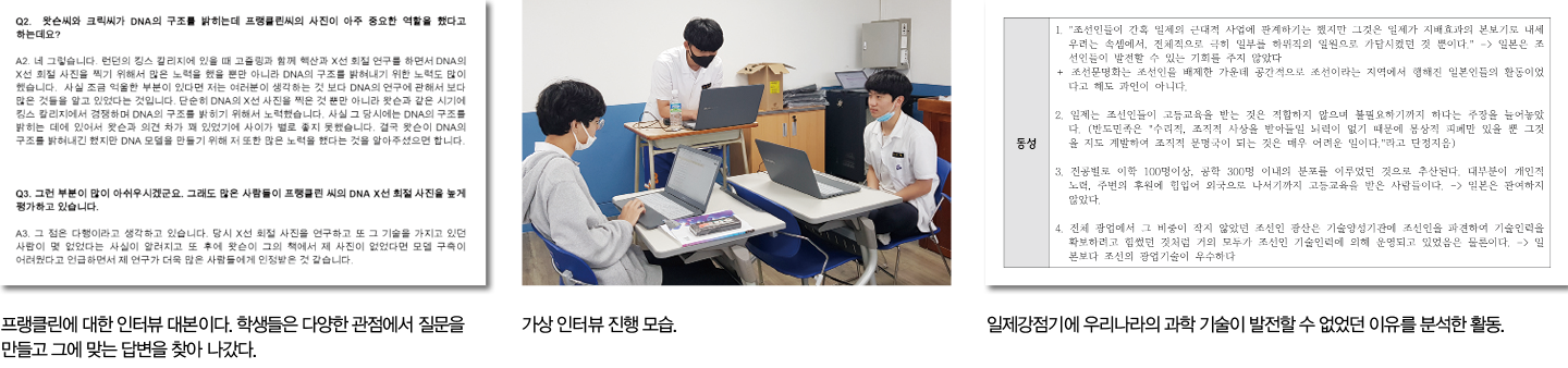 장 교사는 “서양 과학사를 배운 뒤 과학자 가상 인터뷰를 진행했다. 학생들이 과학자를 선정해 인터뷰 질문지와 답변을 작성하고, 발표하는 형태다. 학생들은 과학자의 이론에 대한 피상적인 질문보다는 업적과 관련해 구체적인 내용을 짚고, 현대 과학에 미친 영향 등도 연결해나갔다. 시대와 환경 속에서 과학자의 연구를 바라보고, 자신의 진로 관련 질문을 연결해보는 등 과학자의 일생, 이론을 다양한 시각으로 탐구하는 시간을 가졌다”고 전했다.