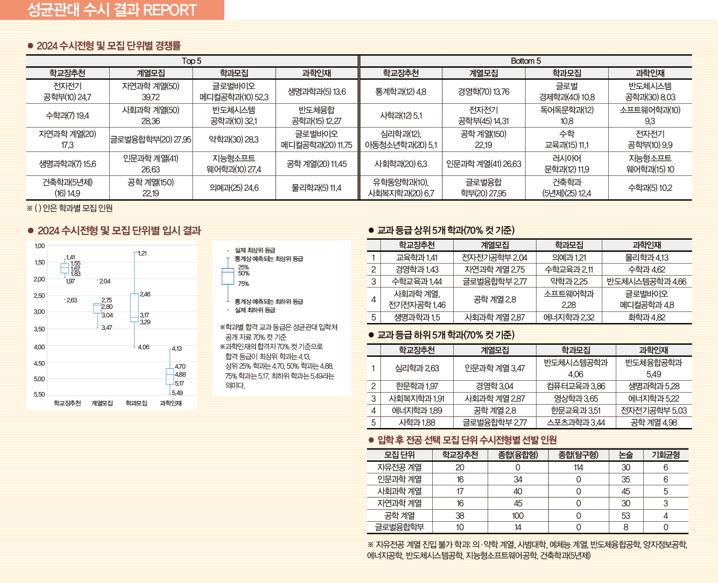 따라서 평소에 의사로서 갖추어야 할 자세와 다양한 상황에 대한 깊은 성찰이 요구된다. 교과전형인 학교장추천은 학과별로 교과 성적의 차이가 뚜렷하다. 단, 합격선은 일반적으로 예측하는 학과의 입결 순서와는 다르다. 전년도 충원율, 교과전형 지원자의 타 대학 지원 경향, 학과별 최저 기준 충족 비율, 실시간 경쟁률 등을 고려해야 한다. 논술전형은 수능을 치른 주말인 11월 16~17일에 실시한다. 자유전공 계열과 글로벌융합학부는 수리 논술을 실시한다. 수리 논술의 시험 범위는 <수학> <수학Ⅰ·Ⅱ>로 줄었다. 입학처 홈페이지의 입시도움방에서 다양한 입시 자료를 공개하고 있다. 교과·종합전형을 준비하는 학생은 <성균관대가 들려주는 고교생활 가이드북>과 <전공 안내서>를, 논술전형을 준비하는 학생은 <논술 가이드북>과 ‘모의논술 강평 영상’을 살펴보면 도움이 된다.